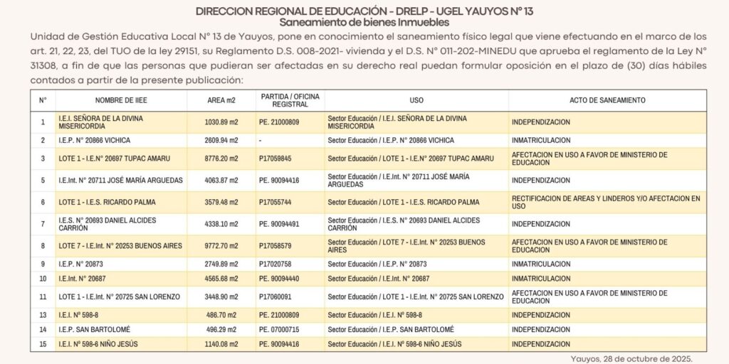 DIRECCIÓN REGIONAL DE EDUCACIÓN – DRELP – UGEL YAUYOS N° 13 by administrador | Oct 28, 2025 | Sin categoría SANEAMIENTO DE BIENES INMUEBLES